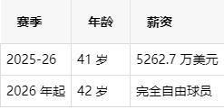 休赛期,詹姆斯行使了 2025-26 赛季价值 5262 万美元的球员选项,2026 年将成为完全自由球员。